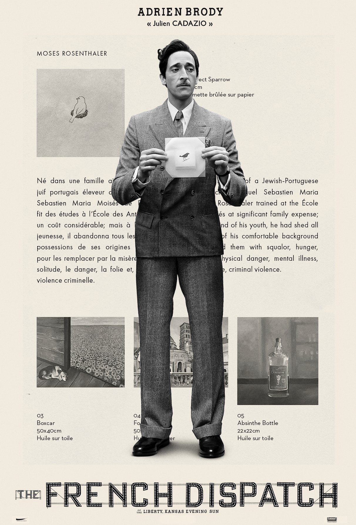 El contenido de las distintas secciones que componen el número a editar va de la información local, ofreciendo el recorrido cicloturista de un reportero (Owen Wilson) que viaja en bicicleta por los barrios de Ennui, contando los entresijos más pintorescos y arrabaleros de la vida de sus habitantes; al acontecer cultural, centrado en el eterno conflicto entre la esencia del arte y el mercado de masas, en una crónica que lleva por título «El Trabajo Maestro», donde la atildada crítica de arte J.K.L. Berensen (Tilda Swinton) narra con refinada ironía, cómo el coleccionista Cadazio (Adrien Brody) descubrió la genialidad del pintor Moses Rosenthaler (Benicio del Toro), encerrado de por vida en un manicomio-prisión y cuya musa es una carcelera (Lea Seydoux) que desborda sensualidad y frialdad en proporciones similares, y quiso explotarla comercialmente.