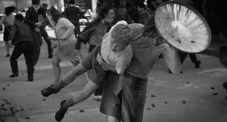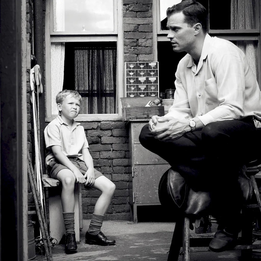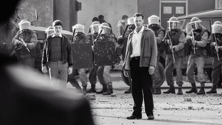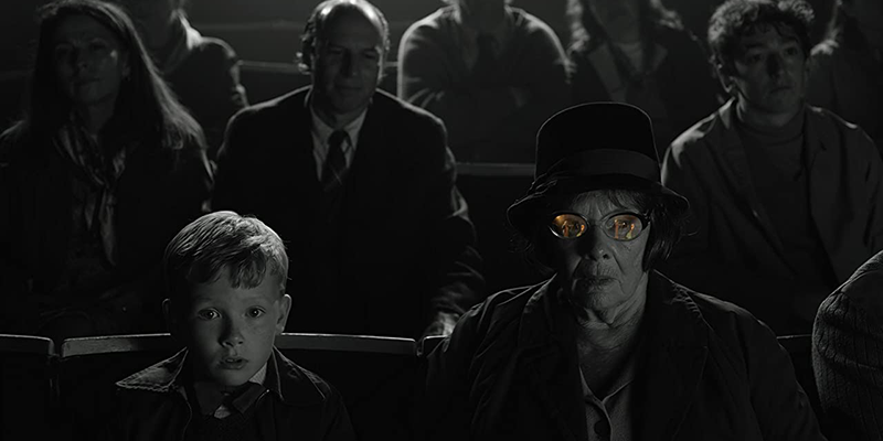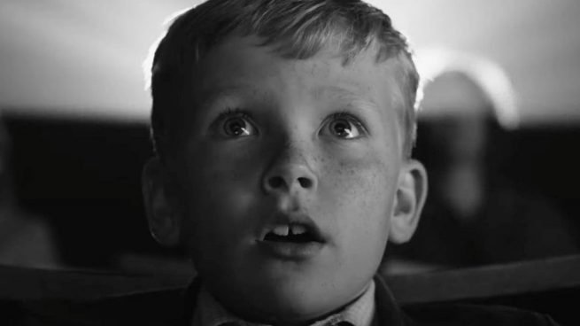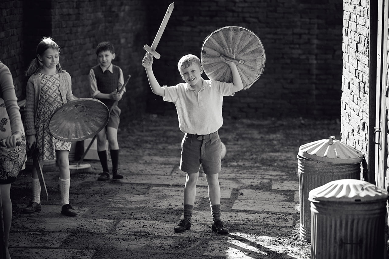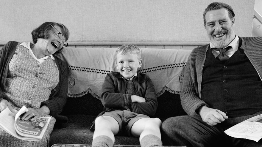 Y es que Branagh ha compuesto con mimo cada plano extraído de sus recuerdos infantiles, tomando nota de la mejor tradición cinematográfica de Bergman, de Buñuel, de Fellini, de Hitchcock, de Orson Welles y hasta de Steven Spielberg, con largos planos-secuencia en escenas de gran dinamismo, pronunciados contrapicados y primeros planos de gran fuerza dramática subrayada por la profundidad de campo y por una fotografía impecable, en nítido blanco y negro, obra de Haris Zambarloukos, su colaborador habitual, que confiere una gran potencia expresiva a encuadres de primorosa factura, que a veces parecen inspirados en el fotoperiodismo, como extraídos de las páginas de un viejo diario, con los antidisturbios desplegados en milimétrica formación, dispuestos a contener las algaradas callejeras. O los breves momentos en que el blanco y negro cede paso al color, haciendo una distinción entre lo que sucede en el cine y en la imaginación del pequeño Buddy, y lo que acontece en la vida real.