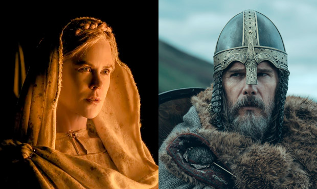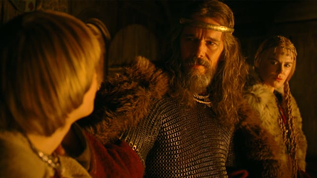 Aquí el príncipe de las tinieblas se llama Amleth y está encarnado por el musculoso Alexander Skarsgård («Godzilla vs. Kong«, «La leyenda de Tarzán«, «True Blood«) -actor sueco de sólidos abdominales que da muestras de saber gruñir y fruncir el ceño mirando a cámara como el mejor aunque se haga menos preguntas que el héroe shakespeariano- quien asume el papel del legítimo heredero de una región de Islandia gobernada por el Rey Aurvandil War-Raven (Ethan Hawke) y su consorte, la ambiciosa e incestuosa Reina Gudrún (Nicole Kidman).