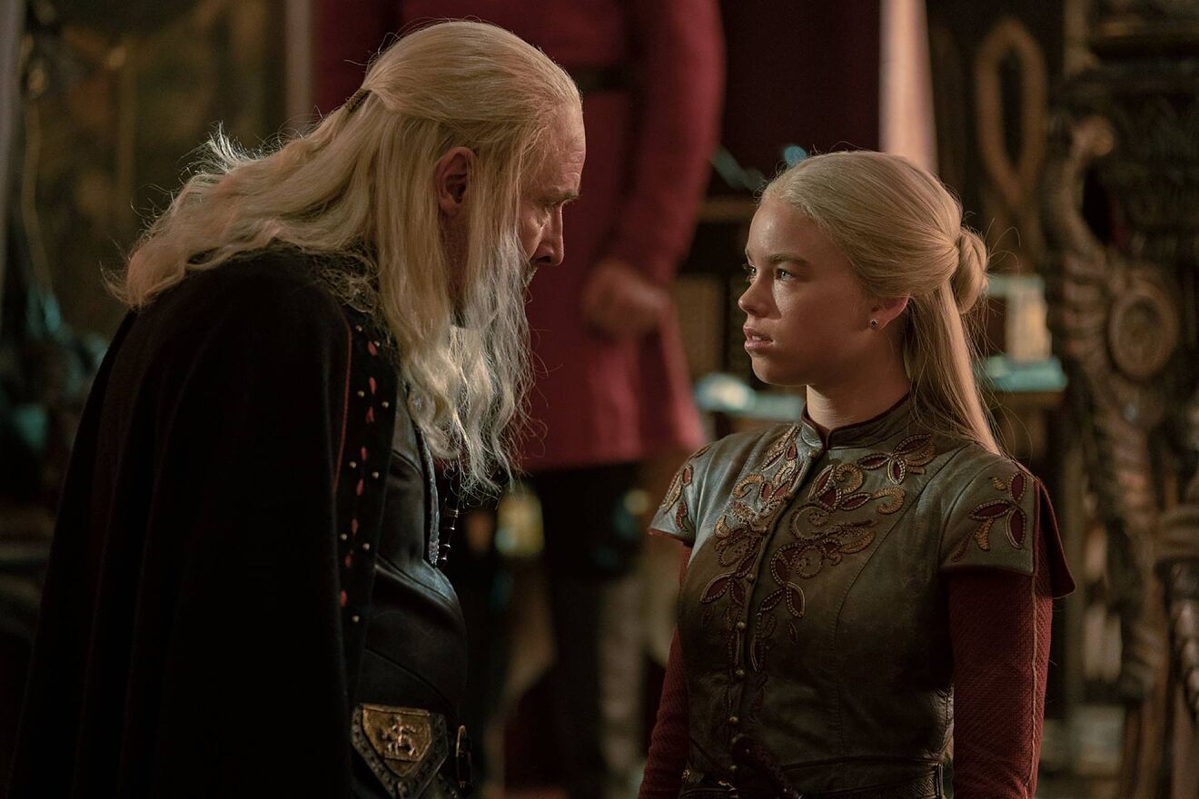 Además de la audaz Rhaenyra en rebelión contra el patriarcado, el otro personaje femenino de interés es Alicent (Emilia Carey/Olivia Cooke), hija de Otto Hightower (Rhys Ifans), “Mano” del rey y gran conspirador de la corte. De ser la mejor amiga y confidente de Rhaenyra, Alicent pasa a ser su peor antagonista al desposarse con Viserys siguiendo las “recomendaciones” de su padre, convirtiéndose así en su madrastra y su reina, y dando a luz a dos hijos varones, Aegon (Tom Glynn-Carney) y Aemond (Ewan Mitchell), a los que la repentinamente ambiciosa Alicent desea ver en el Trono de Hierro, como corresponde a su legítimo derecho sucesorio, según la ley sálica.