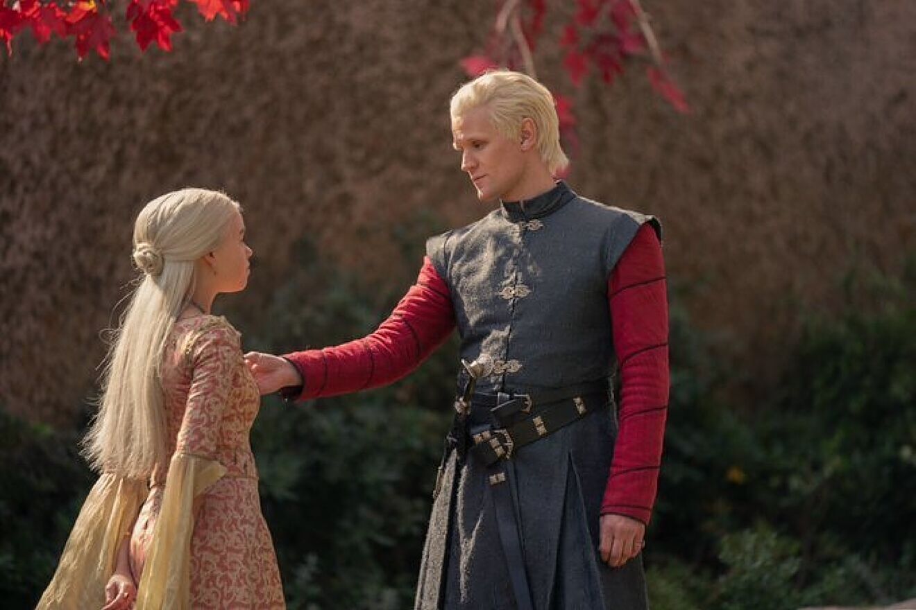 Viudo de su primera mujer, cuya vida se ve obligado a sacrificar para salvar al bebé que esperaban (el anhelado primogénito varón que acabará muriendo a las pocas horas de nacer, durante un parto complicado), Viserys decide que su heredera sea su hija mayor, la adolescente Rhaenyra (a quien encarna en los primeros episodios la extraña joven Milly Alcock cuya actuación resulta en general bastante plana, reemplazada en su edad adulta por Emma D’Arcy de quien puede decirse otro tanto). Lo que desata la furia de los miembros del Consejo del Rey y en especial de su tío Daemon (Matt Smith), hermano de Viserys, quien reclama su lugar en la línea sucesoria y al que veremos sobresalir en el campo de batalla como jinete de dragones.