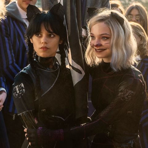 Los traumas del pasado que la persiguen tienen que ver con la crueldad del mundo que la rodea y que no llega a aceptar ni a respetar su singularidad y la de los suyos, algo que la mantiene en constante alerta haciendo que desconfíe de todo y de todos e inhibiendo por completo la expresión de sus emociones. Aunque a lo largo de la serie vemos cómo el personaje evoluciona desde la insensibilidad absoluta hacia un ser que toma consciencia de sí misma, al desarrollar inesperados sentimientos de sincera amistad por su compañera de cuarto, la lobita Enid Sinclair (Emma Myers) que, muy a su pesar, llena su enlutado mundo de color (ambivalencias que, en el universo visual de Burton, sirven para crear bellas antítesis cargadas de significado); confusos y novedosos estados de atracción romántica por el guapo camarero e hijo del Sheriff, Tyler Galpin (Hunter Doohan) o por su enigmático compañero de clase Xavier Thorpe (Percy Hynes); o un profundo instinto de solidaridad con el débil, que se demuestra tanto en el instinto de protección hacia su hermano Pugsley (Isaac Ordonez) de quien cuida con devoción maternal, como en su simpatía hacia Eugene (Moosa Mostafa), un friki criador de abejas.