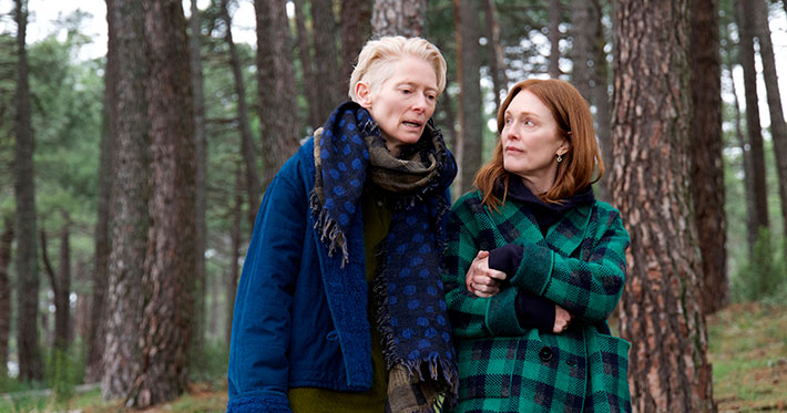El comprensible dilema moral que se abre para Ingrid ante semejante propuesta es esbozado y resuelto con una precipitación y una falta de profundidad decepcionantes. Ingrid no lo duda. Simplemente accede a la petición de Marta, se supone que como un magnánimo gesto de amistad y generosidad. Aunque está preocupada por las consecuencias que ello puede acarrearle con la justicia al ser la eutanasia algo ilegal. Al principio de mudarse juntas a una casa de diseño vanguardista en las afueras de la ciudad (que en realidad está en El Escorial), parece albergar una vaga esperanza de poder hacer que Marta entre en razón y abandone la idea de dejarse ir. Pero, al ver que está resuelta a hacerlo, se dedica a brindarle compañía y afecto en sus últimos días que transcurren plácidamente entre paseos por el bosque, películas de cine mudo, gestos de cariño entre ambas y recuerdos de juventud, en un escenario en el que predominan los colores primarios del universo almodovariano y en el que todo luce tan artificioso, tan prefabricado y tan gélido como las conversaciones entre ambas y la nieve que “cae sobre los vivos y los muertos”, como en “Los Dublineses” de John Huston, gran testamento cinematográfico basado en el soberbio relato de Joyce, que el director de «La reina de África» rodó en silla de ruedas y con máscara de oxígeno, y que a diferencia de la última película de Almodóvar no deja helado, sino profundamente conmovido al espectador.