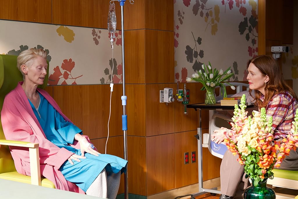 Basada en la novela homónima de la escritora estadounidense Sigrid Nuñez (de madre alemana y padre chino-panameño) la historia que cuenta podría ser muy potente de no estar tan desaprovechada. Se trata de dos viejas amigas, Ingrid (Julianne Moore) y Martha (Tilda Swinton) que, a pesar de haber estado muy unidas en el pasado y haber compartido incluso (aunque no simultaneado en el tiempo) el mismo amante (Damian, John Turturro), se reencuentran después de años de haberse perdido la pista. Ingrid es autora de éxito y acaba de publicar un libro de autoficción donde, por estas casualidades de la vida, se duele de la inexorabilidad de la muerte. Martha ha sido reportera de guerra, pero le han diagnosticado un cáncer de útero y está internada participando en un ensayo clínico experimental, por lo que, al enterarse por casualidad a través de una amiga común, Ingrid no duda en ir a verla.
