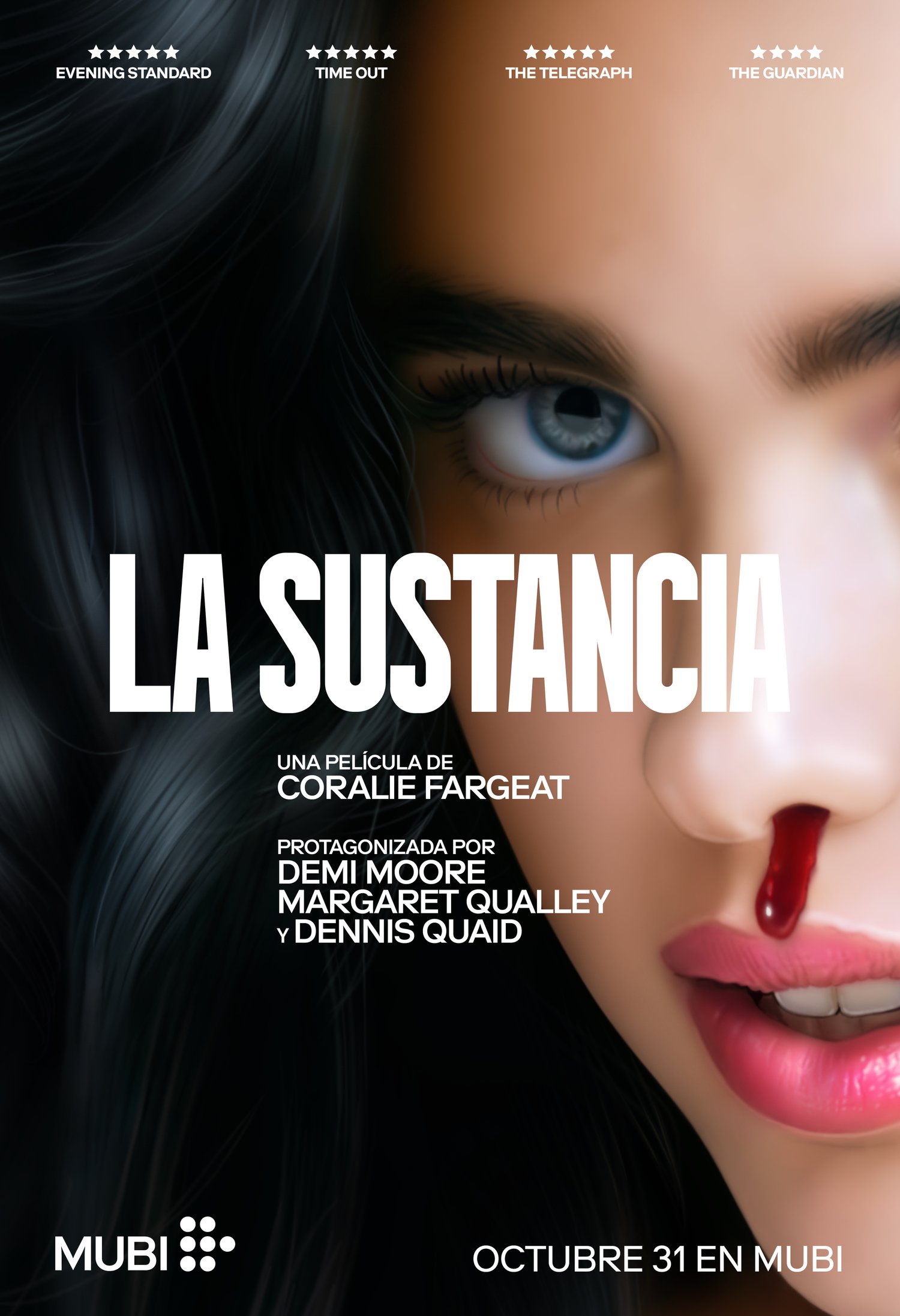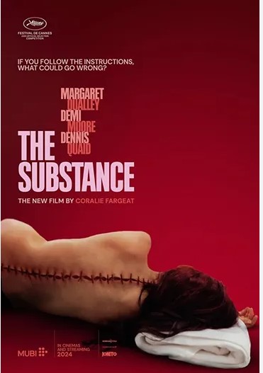 La película nos propone una reflexión al respecto de los peligros que entraña desafiar a la biología, a la naturaleza y (para aquellos que crean en él) al propio Dios. Quizás no resulte muy original en su planteamiento, pero en su confección sin duda lo es. Desde esa primera secuencia del huevo transgénico hasta la escena final en la que el experimento se sale de madre. Hay en ella trazas de David Cronenberg (“Shivers”), de David Lynch («El hombre elefante«), de Nicholas Winding Refn («The neon demon«), Guillermo del Toro («El laberinto del fauno«), Julia Ducornau (“Titane”) y hasta de Hitchcock («Psicosis«), pero la directora parisina consigue llevarla a su terreno, en complicidad con Demi Moore que no duda en parodiarse a sí misma, y de Margaret Qualley («Pobres criaturas«) cuya actuación aquí es sublime, para advertirnos de que las posibilidades que ofrece la alteración genética podrían acabar produciendo el mismo efecto adictivo de consecuencias indeseables que observamos ahora con la cirugía estética.