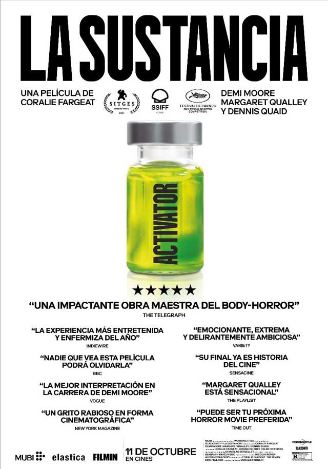 ¿Alguna vez has soñado con ser una mejor versión de ti misma? ¿Más joven, más hermosa, perfecta? Partiendo de una premisa bastante explorada por el séptimo arte: ¿cuál es el precio que estamos dispuesto a pagar por la eterna belleza y juventud? «La sustancia» elabora una historia cuyo atractivo engancha de entrada, mantiene cierto interés en su desarrollo y, como suele ocurrir a menudo en este tipo de cine que raya lo gore, desbarra -pero muy mucho- en su previsible y delirante final, que acaba siendo una carnicería y un baño de sangre, en sentido literal.