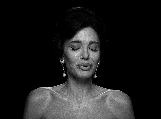 Con un inteligente guion de Steven Knight, en el que los espléndidos diálogos funcionan casi a la manera de oráculo y la narración se plantea como una especie de cuenta regresiva marcada por el fatalismo que va a acercando a la protagonista inexorablemente hacia su último aliento, la película de Larraín está hasta tal punto concebida como un réquiem de homenaje a la artista, que la primera escena que vemos tras la muerte de la Callas (justo antes de que la veamos quemar los vestidos de sus grandes personajes: arde el final de una época para empezar otra marcada por la desolación) es la de un plano fijo del rostro de Angelina Jolie en blanco y negro, interpretando en playback la oración nocturna de Desdémona (quien sospecha que su celoso amante la matará esa noche) que la divina grabó hacia el final de su carrera, aunque nunca llegó a encarnar a ese personaje en el Otello de Verdi en el escenario.