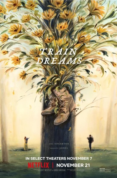 Basada en la novela homónima de Denis Johnson, el guion de Sueños de trenes es una adaptación del propio Bentley, en colaboración con el también cineasta Greg Kwedar (Las vidas de Sing Sing) y está escrito, estilísticamente hablando, a la manera de Hemingway, con poética serenidad y sin sentimentalismo alguno, sumando cada fragmento significativo de la vida de una persona común y corriente a lo largo de toda su existencia. Desde sus primeros recuerdos –ese viaje infantil en tren que lo conduce hacia su nueva familia– hasta sus últimos pensamientos, que no alcanzó a compartir con nadie, la vida entera de Grainier se despliega ante nuestros ojos en esta suerte de poema fílmico, a medida que transcurren las estaciones: la primavera del amor con la etérea y a la vez terrenal Gladys (¡Que bien elige siempre Feliciy Jones sus papeles!), el caluroso verano de labor incansable junto a hombres rudos, lejos de casa, el otoño de la pérdida y el invierno de la soledad, la nieve y el silencio. La relación del hombre con la naturaleza se subraya a través de una sinfonía de hermosas imágenes: las bucólicas y soleadas escenas campestres de los dos enamorados proyectando la cabaña que piensan construir a orillas de un río para compartir sus vidas, las columnas de fuego del temible incendio forestal que acaba años después con ese refugio paradisíaco -«el único lugar en el Robert que quería estar«- reduciéndolo a cenizas, el cielo estrellado bajo el que duerme a la intemperie mientras espera el improbable regreso de su mujer y su hija o su lecho de muerte invadido por la maleza, el musgo y las flores silvestres.