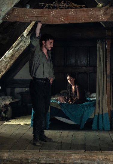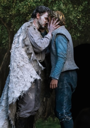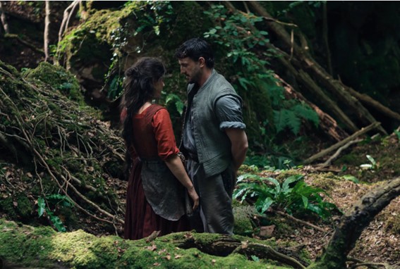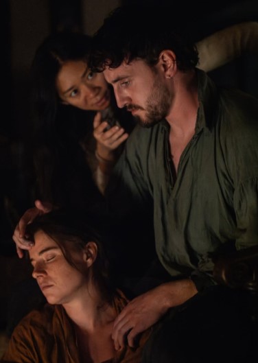 Antes de la tragedia, la puesta en escena bucólica y forestal subraya una intimidad plácida en la que los cuerpos de William y su mujer se buscan con pasión y deseo. Pero, tras la muerte de Hamnet, el amor se convierte en un territorio minado. La película muestra cómo el dolor no compartido rompe el diálogo: ella permanece atrapada en la presencia fantasmal del hijo ausente, mientras él opta por la huida física y emocional. La cámara refuerza esa distancia con encuadres que los separan y silencios prolongados que sustituyen a las palabras que ya no saben decirse.
