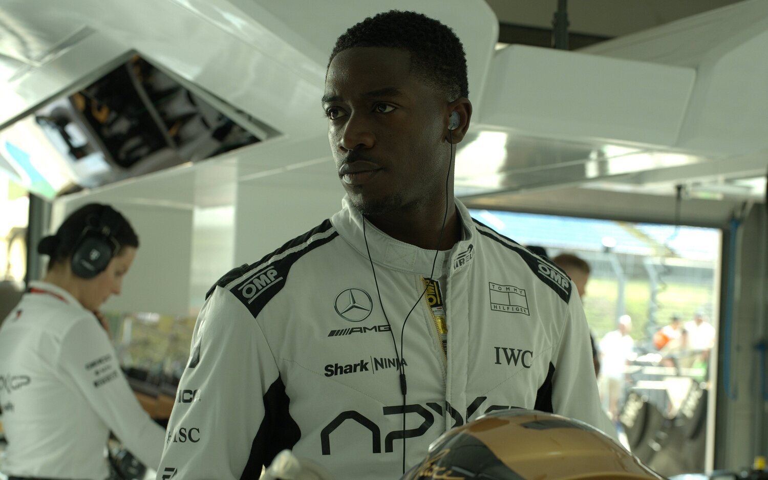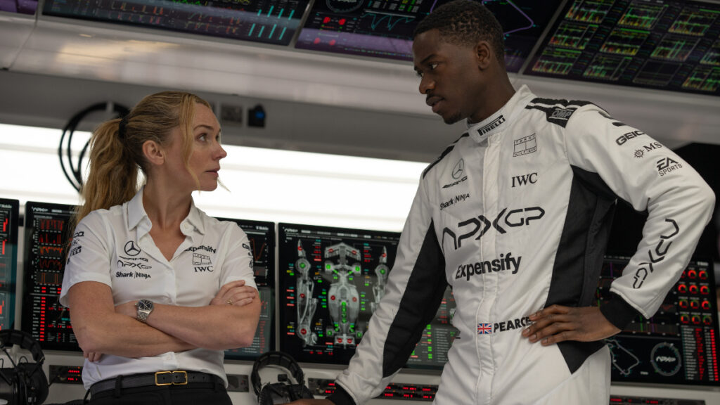 Su llegada al equipo despertará el interés romántico de la brillante ingeniera de la escudería, Kate McKenna (Kerry Condon) Y los recelos de la joven promesa del equipo, Joshua Pearce (Damson Idris), un piloto novato y arrogante, que vive para la fama y el dinero de las marcas, quien siente amenazado su liderazgo y establece con él un duelo generacional que sirve como combustible dramático a la historia sin entrar en demasiadas complejidades. Porque la película no busca profundidad, sino ritmo. Cada carrera introduce un obstáculo distinto y el montaje prioriza el afán de superación.