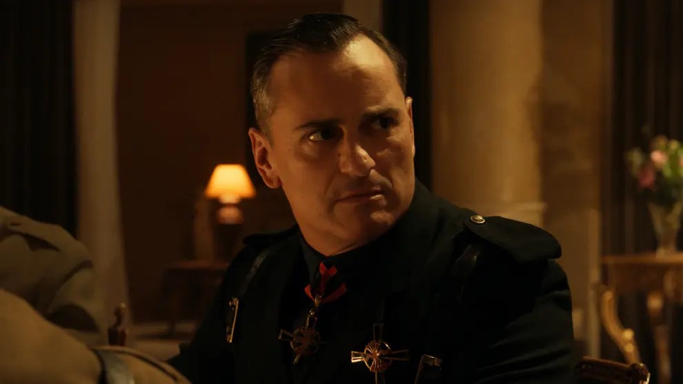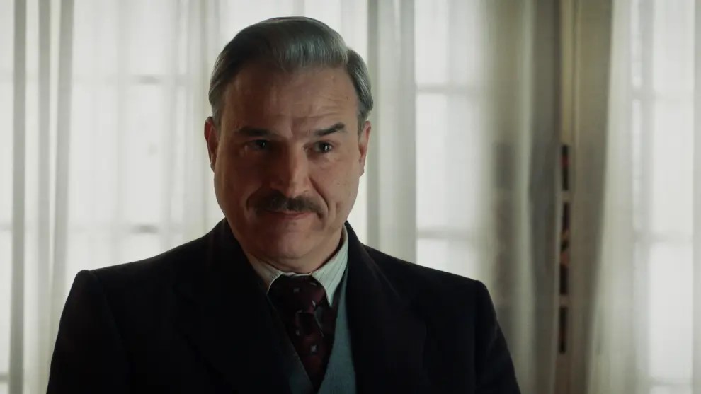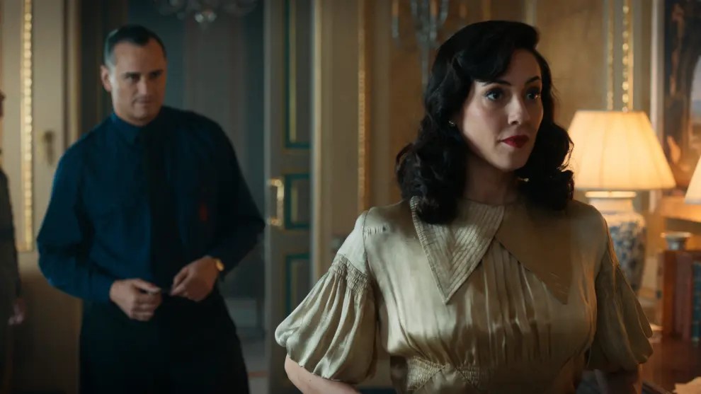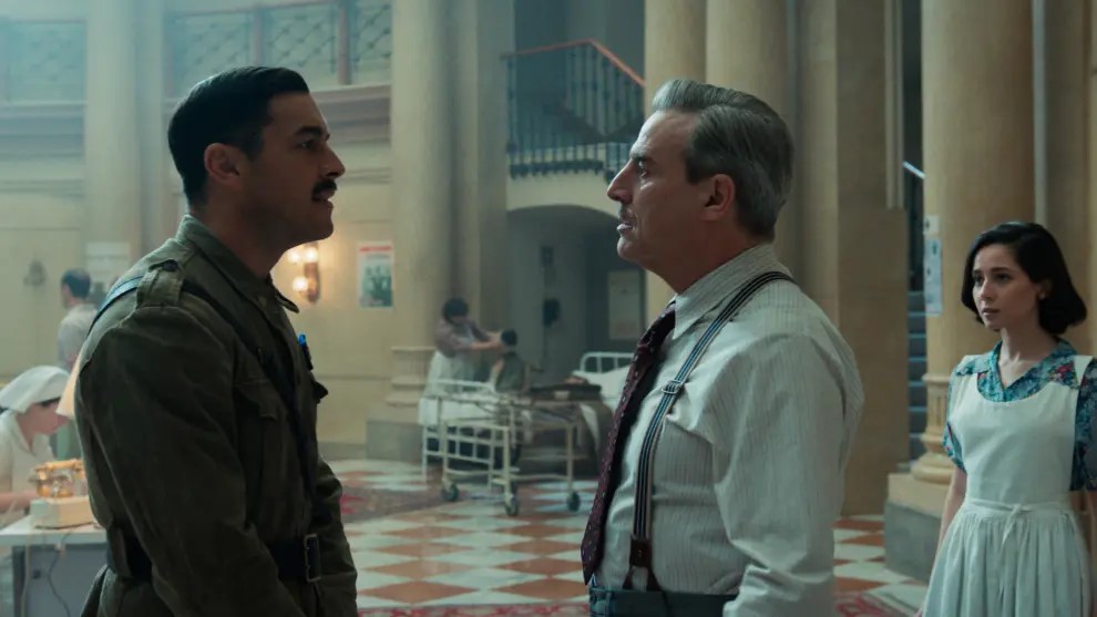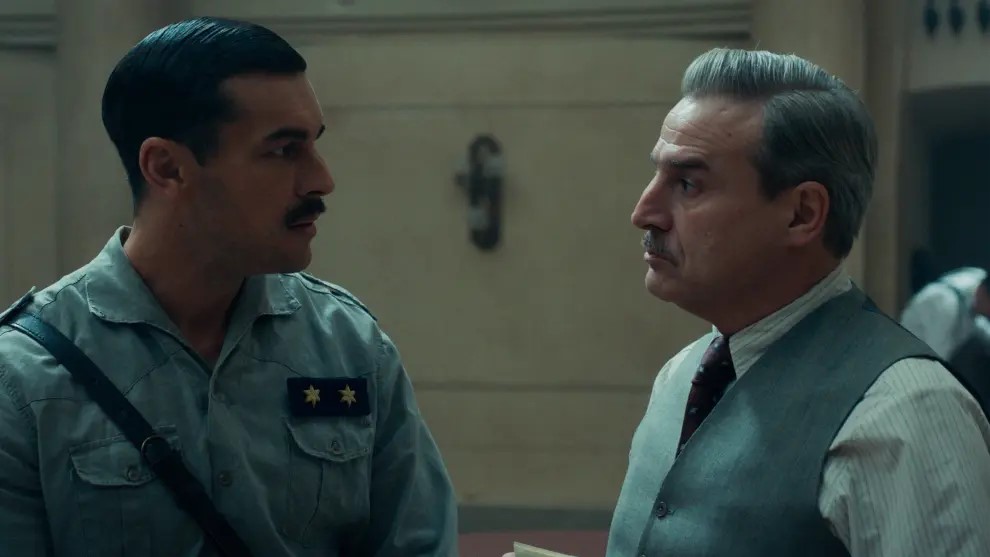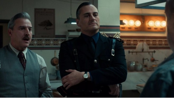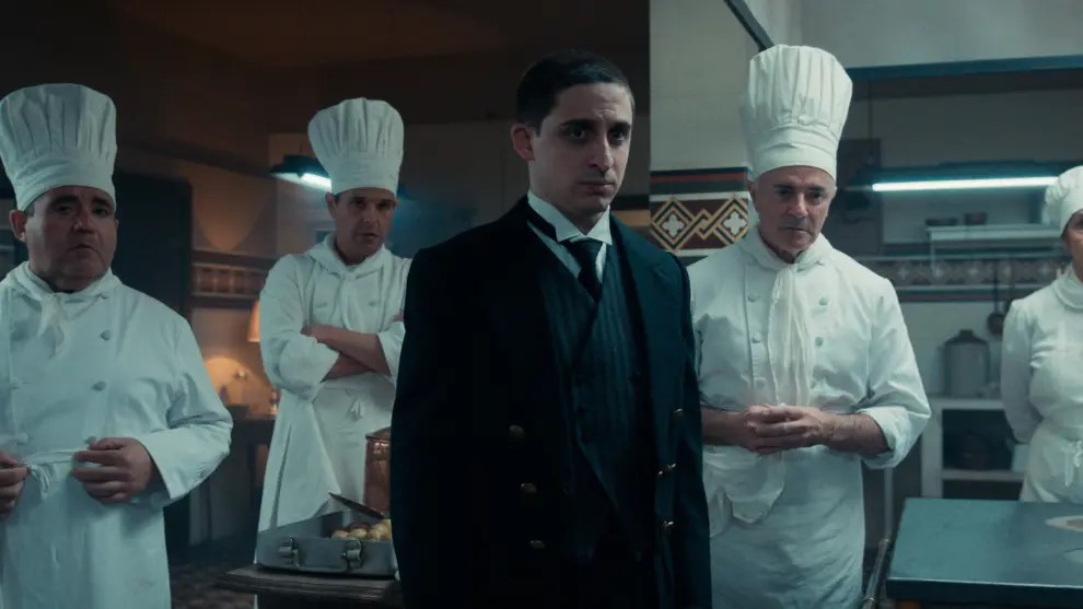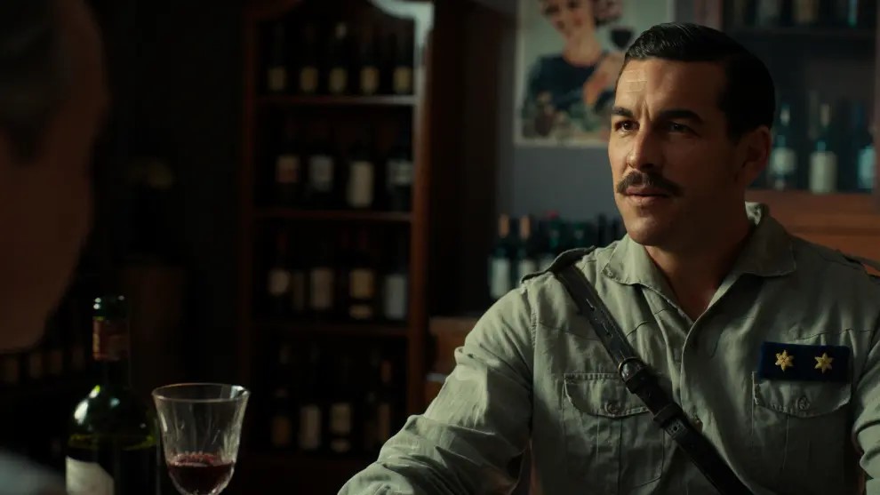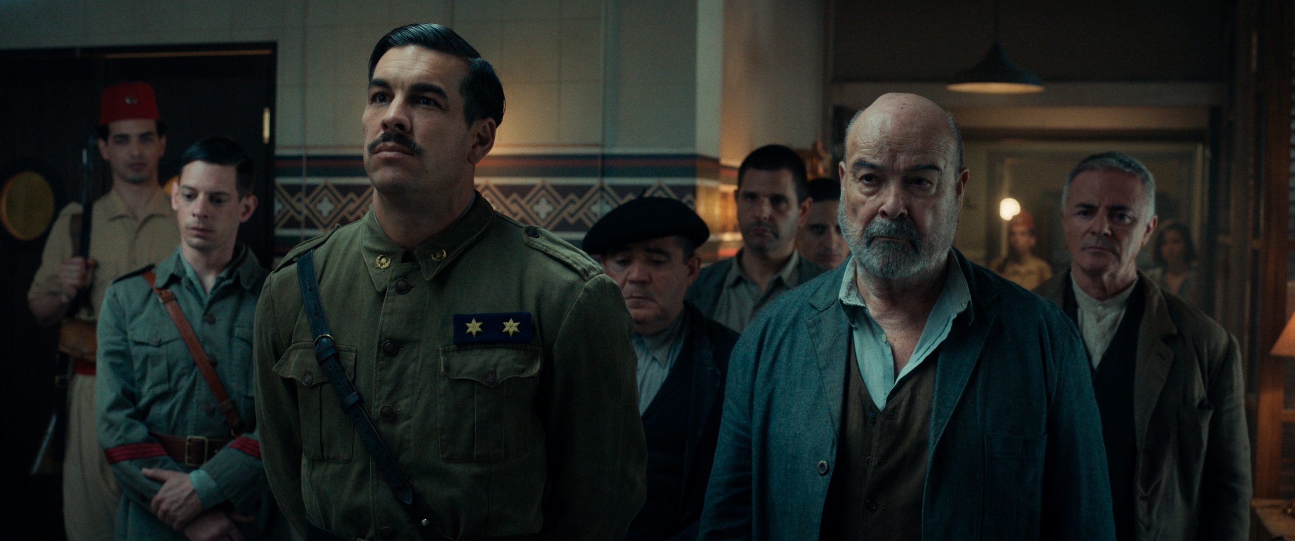 San Juan convierte al maître en un aristócrata de opereta con nervios de acero, mientras Casas explota su propia imagen en una autoparodia que encaja sorprendentemente bien en el caos general. Asier Etxeandía, como antagonista hiperbólico, en el papel de José Luis Alonso Candelas, oficial de La Falange y superior de Medina, aporta a la situación una amenazante brutalidad, que es a la vez ridícula y peligrosa. Es un psicópata que no duda en sacar la pistola y asesinar a cualquiera que le contradiga. El tipo de villano que parece salido de un tebeo pero que funciona precisamente por ese exceso. Alrededor, secundarios que entran y salen como en un vodevil, manteniendo el ritmo de la chanza argumental con distintas tramas: el plan de fuga de los cocineros, la esposa dispuesta a todo con tal de medrar o la futura maternidad de la cantante… mientras se nos muestran las consecuencias de la Guerra Civil, la miseria de la ciudad y las terribles represalias del bando vencedor.